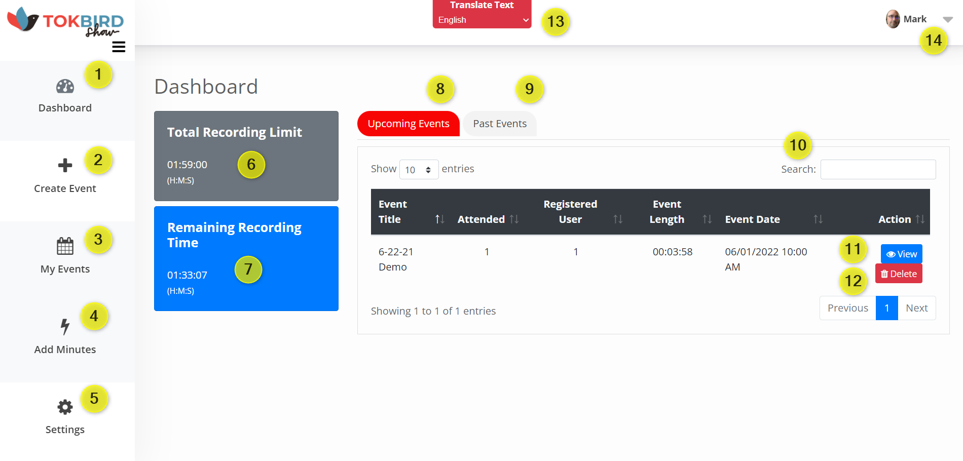 This section of TokBird Show allows you to see an overview of your Upcoming and Past events.